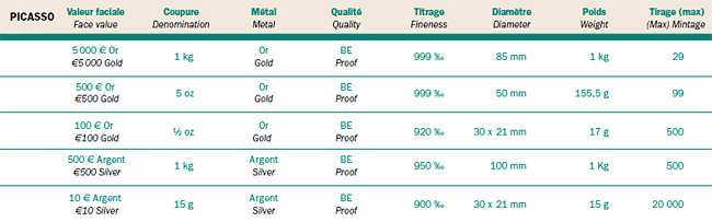 After featuring four great Impressionist painters, Monnaie de Paris is now paying tribute to modernist painters. Pablo Picasso (1881-1973), Spanish painter, draughtsman and sculptor. He was the founder of Cubism along with Georges Braque, his partner in Art and Surrealism. He is, without doubt, the greatest painter of the 20th century due to his insistence on always questioning the various styles approached in his works. Each coin depicts a painting which is emblematic of the artist and features the creation date, the artist’s signature and his portrait.