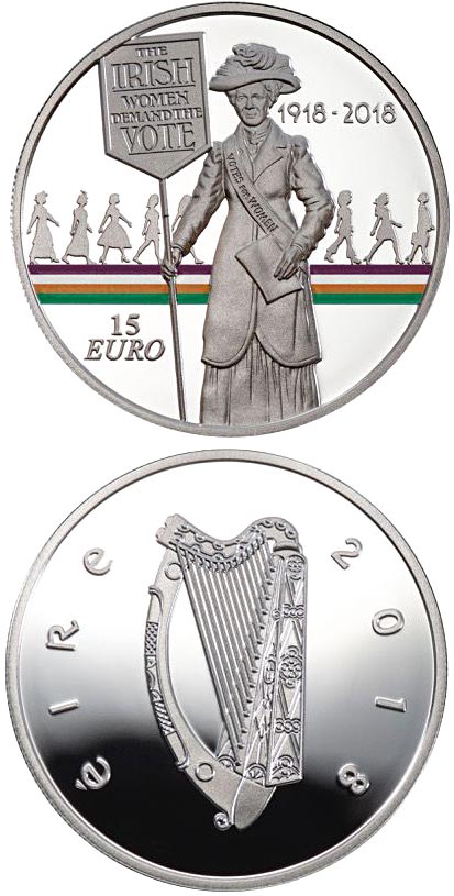 Behind her in silhouette is a procession of confident and determined women marching forward to represent the progress in equality from 1918 to present day. They stride along a road painted in the colours of the suffragette movement in Ireland. This is the first Irish commemorative coin to feature colour since the Special Olympics coin 2003.