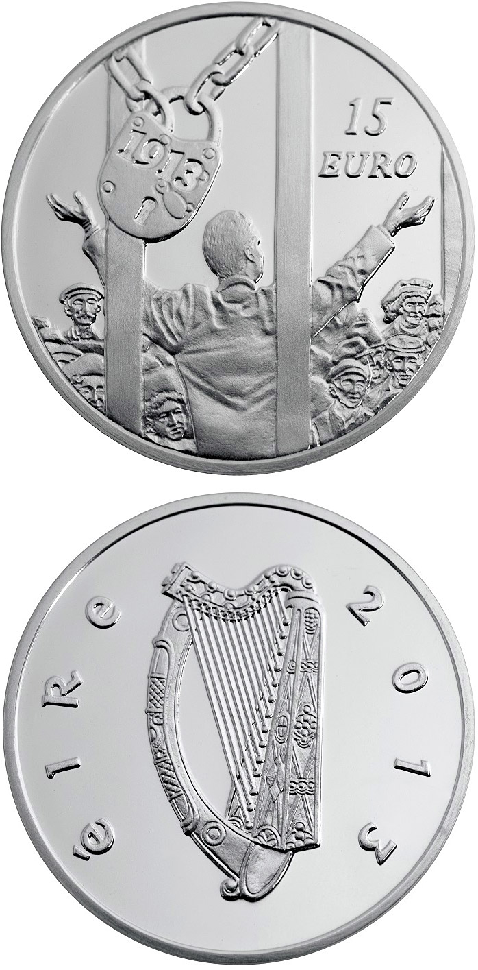 The 2013 €15 Silver Proof coin commemorating the centenary of the 1913 Dublin Lockout will be launched on 24 September 2013. The coin has been designed by renowned sculptor Rory Breslin.