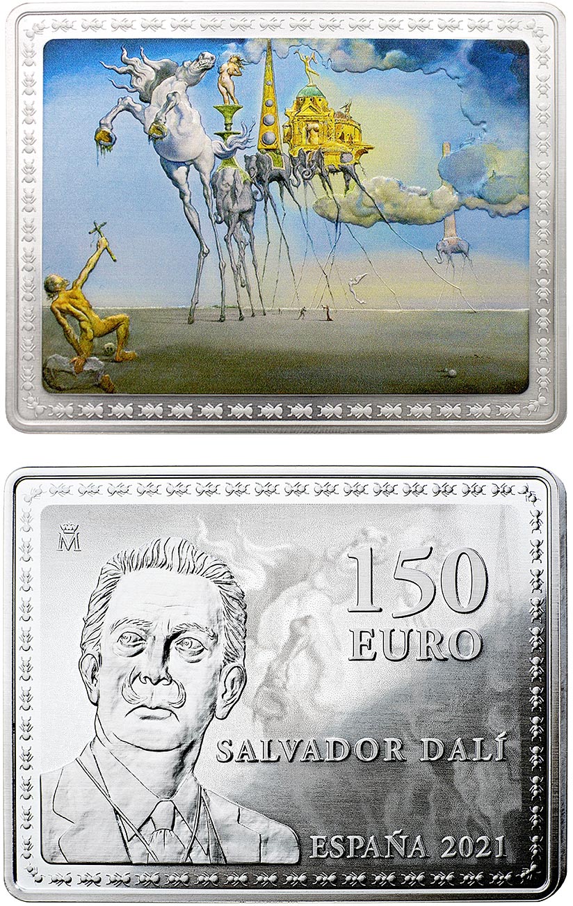 On the obverse, an image of Salvador Dalí’s painting, The Temptation of St. Anthony, which is kept at the Royal Museums of Fine Arts, Brussels (Belgium). The image is surrounded by a border in the form of ants in procession.