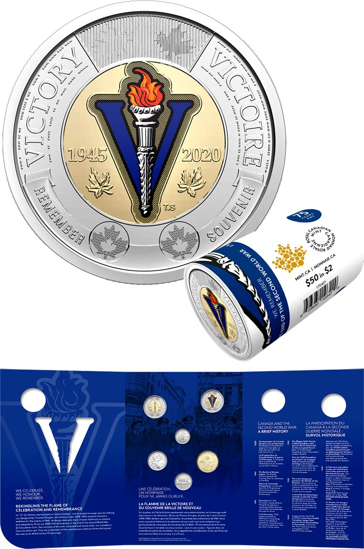 The 2020 75th Anniversary of the End of the Second World War $2 commemorative circulation coin places a piece of our history in your pocket change… but a Special Wrap Roll instantly adds 25 of them to your collection.