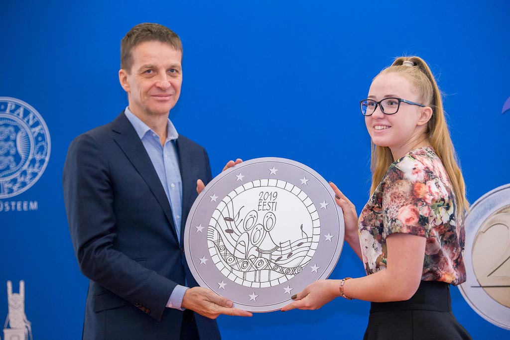 The design for the two-euro coin by Grete-Lisette Gulbis, a student at Tõrva Gümnaasium in the south of Estonia, received 2887 votes, representing 35% of the total of 8322. “At first I didn’t want to submit my design to the competition as I wasn’t entirely happy with it, but my parents encouraged me and so finally I sent it in”, she said. Grete-Lisette was inspired for her design by the Song Celebration procession, where she had seen the cheers of joy and pride, the multitude of national costumes and the rows of singers flowing like waves on the sea.