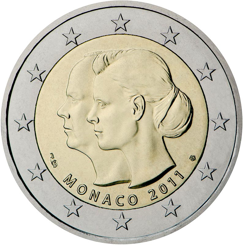 The inner part of the coin shows, at the centre, the effigies of Prince Albert and Princess Charlene. At the bottom, the name of the issuing country ‘MONACO’ and the year of issuance ‘2011’. The mint mark and the mint engravers mark appear before and after ‘MONACO 2011’, respectively.