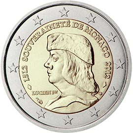 Description: The The inner part of the coin shows a portrait of LUCIEN 1er Grimaldi in profile facing to the left. The words “SOUVERAINETE DE MONACO” appear above the portrait in an arc along the upper edge of the inner part of the coin, flanked by the years "1512" and "2012". Two ornamental details are engraved at the beginning and at the end of the text. At the bottom, the horn of plenty, mintmark of the "Monnaie de Paris" and the "fleurette", hallmark of the engraving workshop, flank the portrait on the left hand side and the right hand side, respectively. Above the mintmark is engraved the inscription "LUCIEN Ier".