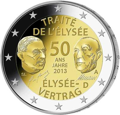 Aus Anlass des 50. Jahrestages der Unterzeichnung des Élysée-Vertrages am 22. Januar 2013, mit dem die deutsch-französische Freundschaft begründet wurde, planen Deutschland und Frankreich die Herausgabe einer gemeinsamen 2-Euro-Münze. Damit wird zum ersten Mal eine motivgleiche Münze von zwei Mitgliedsstaaten der Euro-Zone emittiert.