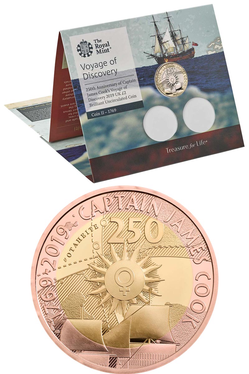 As we mark 250 years since Cook's time in Tahiti, The Royal Mint continues its celebration of his great voyage with the second of three coins. Artist Gary Breeze commemorates Captain Cook’s time at Tahiti in 1769, with a design featuring the mast of the HM Bark Endeavour below a celestial image of the Transit of Venus. Finished to Brilliant Uncirculated standard, superior to the coins in your change, this £2 coin commemorates the life and legacy of the last of the great sea explorers.