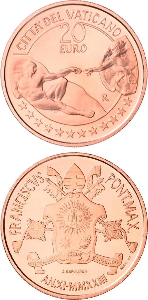 The Vatican State Mint continues its “Art and Faith” series by dedicating the 20 euro copper coin to Michelangelo’s Creation of Adam. Artist Antonella Napolione reproduces on the coin’s reverse side one of the world’s most celebrated and renowned paintings: The Creation of Adam. This fresco was painted by Michelangelo Buonarroti around 1511 and is part of the vault of the Sistine Chapel. Adam, lying on the ground, turns his gaze toward the Creator by extending his left hand toward Him. God, suspended in a cloud, extends His right hand towards Adam in the act of giving him life.