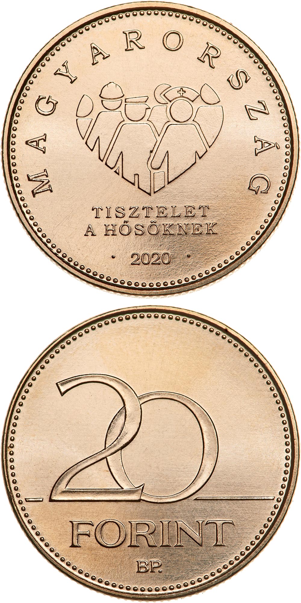 Inside the string of pearls along the edge of the coin the upper legend features “MAGYARORSZÁG” (Hungary), while the lower legend shows “2020”, the year of minting, between two dots. The unknown heroes – of various professions and occupations, standing firm in the emergency – are schematically depicted, in the shape of a heart in the middle of the field, with the words “TISZTELET A HŐSÖKNEK” (tribute to the heroes) in two lines.