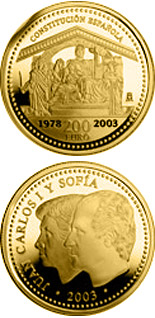 Minted in Proof quality and presented in a jewel-case, the coins commemorating the 25th Anniversary of the Spanish Constitution show on the obverse the overlapping effigies of Their Majesties King Juan Carlos and Queen Sofia. The reverse of the coin reproduces the central part of the frontispiece crowning the main façade of the Palace of Congress, portraying an allegory of Spain embracing the Constitution, flanked by Justice and Fortitude.