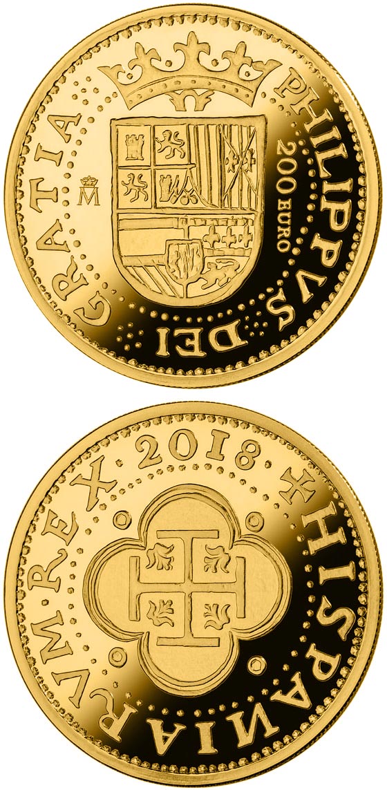 The obverse of the original piece bears the monarch’s Royal Coat of Arms with the quarters of Castile and León, Granada, Aragon, Sicily, Austria, Burgundy (old and new), Brabant, Flanders and Tyrol. On either side of the coat appear the Real Casa de la Moneda of Madrid mark and the value of 200 EURO. The whole is surrounded by the legend PHILIPPUS II DEI GRATIA.