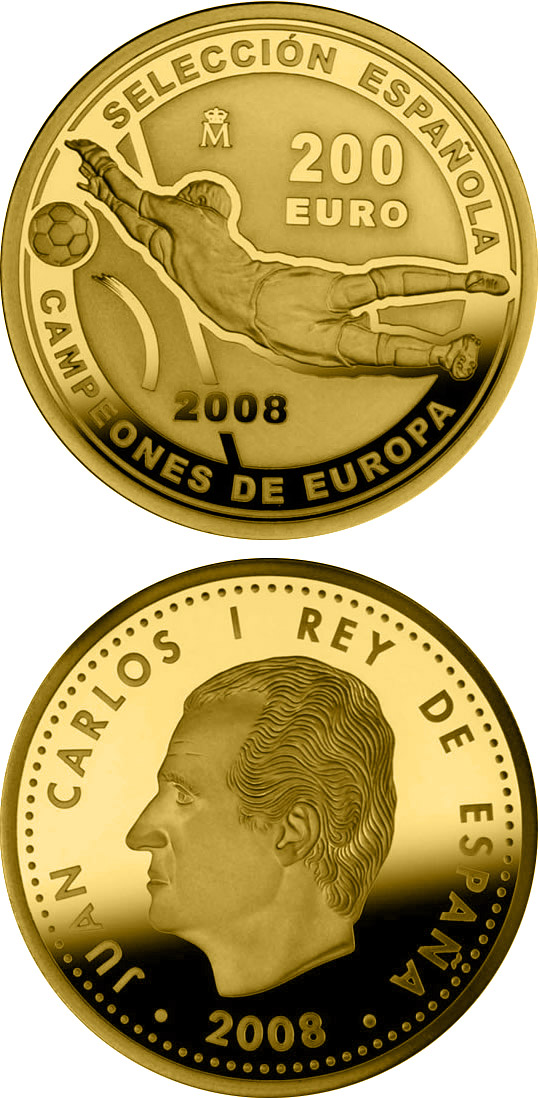 200 euro - European Champions 2008Series: Spain - Gold 200 euro coins The obverse of the .999 gold coin portrays the head of H.M. King Juan Carlos I. The reverse reproduces in the center the figure of a goalkeeper in the act of saving the ball.