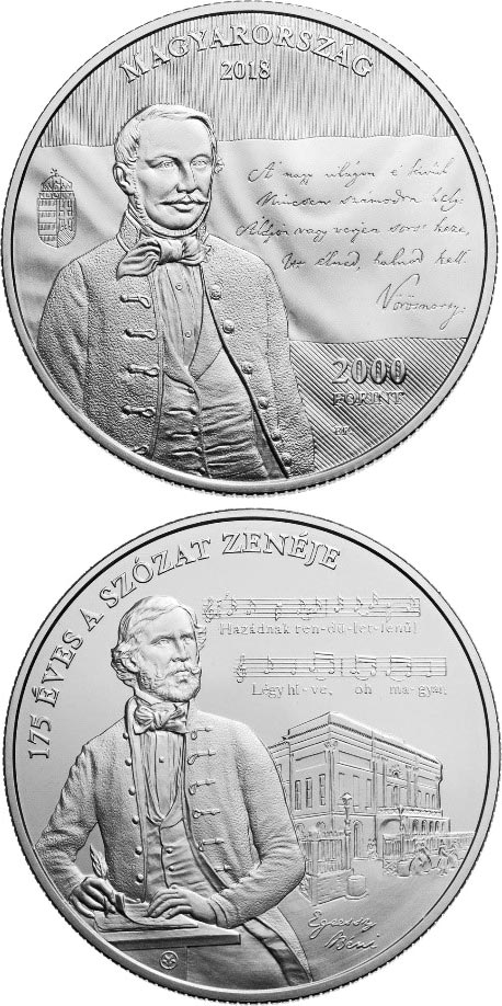 The compulsory design elements of commemorative coins are placed on the obverse: the lettering “MAGYARORSZÁG” in the upper legend, under it, the mint year 2018, and below, to the right in three lines below each other the value numerals 20.000 and 2000 FORINT and the mint mark “BP.”, which includes security features in micro lettering to provide protection against counterfeiting. On the reverse side of the commemorative coin a half-body portrait of Béni Egressy, the composer of the music to the Appeal is shown, which was also inspired by a Miklós Barabás’ painting. The representation of the old building of the National Theatre is positioned in the background: the premiere of the musical composition took place here. The lettering “175 ÉVES A SZÓZAT ZENÉJE” highlights the occasion the coin is issued on. Next to Egressy’s figure a part of the sheet music for the Appeal, the starting melody often quoted in later compositions is shown, while the composer’s signature is placed at the bottom. The master mark of applied artist Gábor Kereszthury, the designer of the coin is hidden in the coin design.
