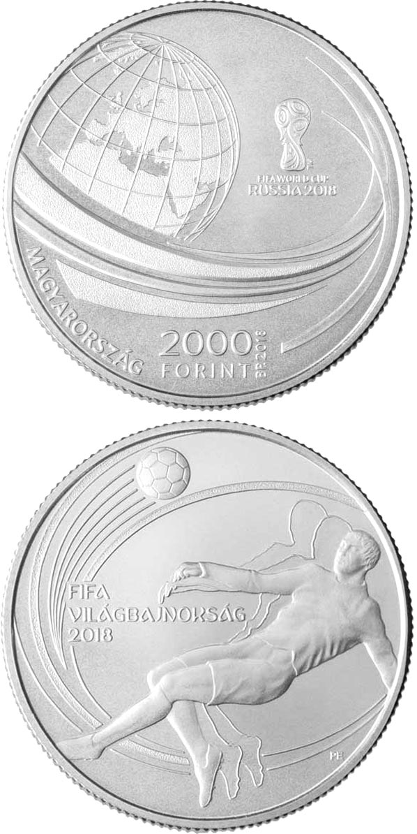 On the obverse side of the commemorative coin the stylised representation of the Earth is shown. The orbits of satellites suggest the rotation of the planet and the dynamic nature of sports. The motif refers to the global significance of the sports event. To the right, the official logo of the 2018 FIFA World Cup Russia™ is shown. The compulsory design elements are also featured here: the lettering “MAGYARORSZÁG” in the lower legend, the lettering “5,000 and 2,000 FORINT” in two lines, one below the other, and vertically oriented, the mint mark ‘BP.’, as well as the year of issuance ‘2018’; all in one column. The micro lettering representing the mint mark provides protection against counterfeiting, which was placed on the left side of the circle running to the right of the mint year. The security element is visible only when magnified at least ten times.