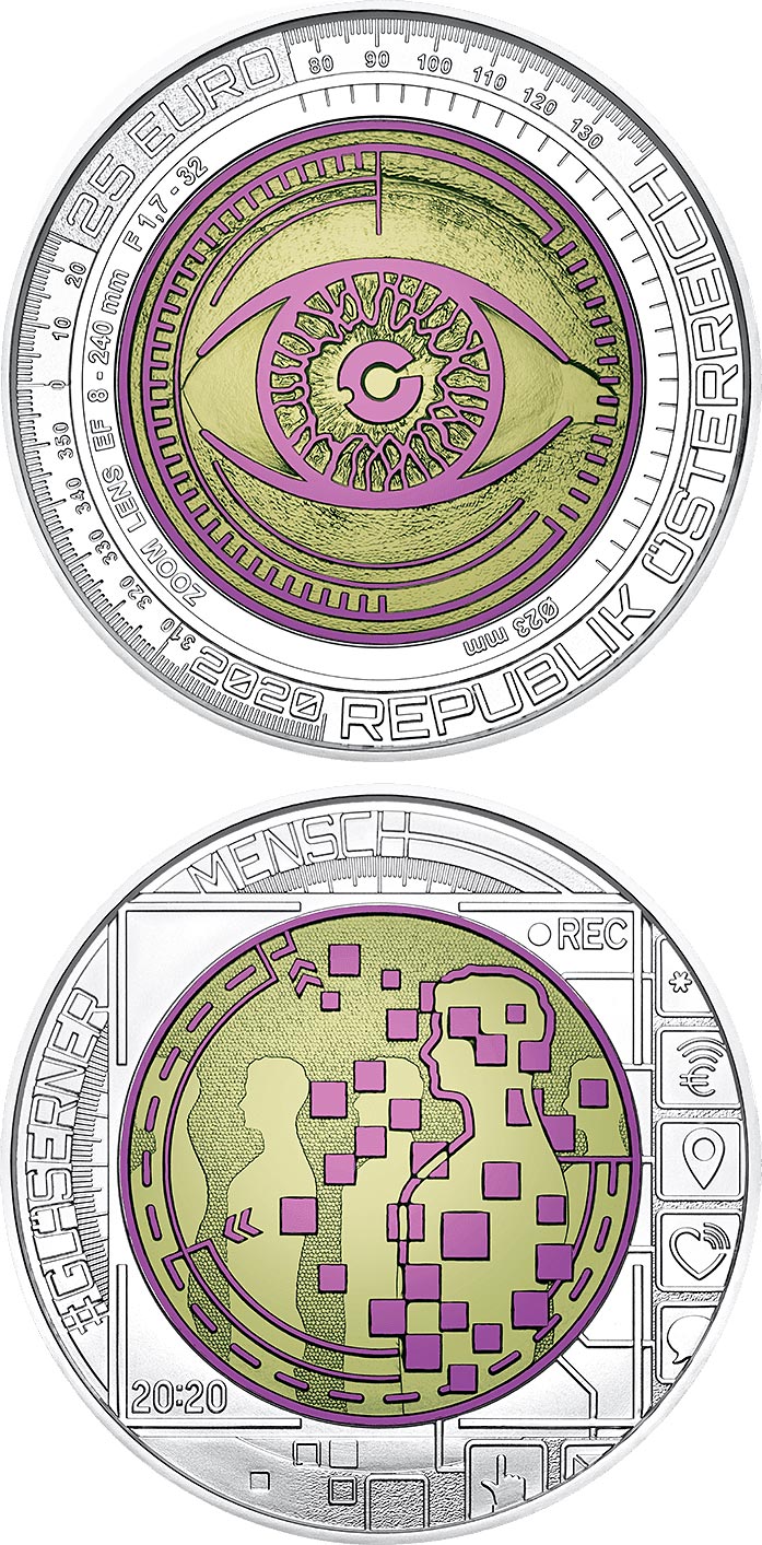 In its niobium core, the obverse of Big Data features a human eye that represents surveillance on the one hand and the biometric method of iris recognition on the other, while the silver outer ring is designed like a camera lens. The reverse of the coin shows people under surveillance, which is recognisable from the 20:20 running time on the left edge of the outer silver ring. In the foreground of the niobium core, one of a number of human silhouettes is peppered with squares that symbolise the personal data collected about that person.