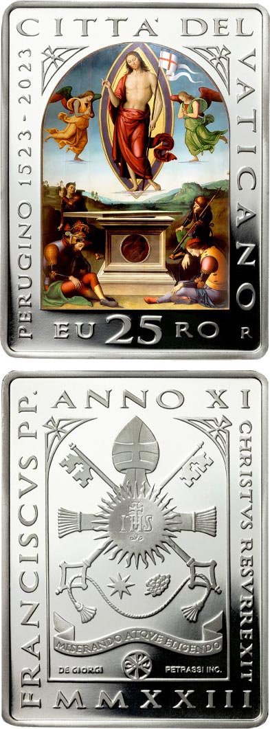 The 25 euro colour coin issued by the Vatican Mint is dedicated to Easter and features the Resurrection of Christ, an oil on panel painting from 1499 by Pietro Vannucci, known as Perugino, who died five hundred years ago this year. The painting is kept in the Pope’s private library in the Apostolic Palace. It displays the Risen Christ ascending into heaven, enclosed in an almond-shaped golden light. In his left hand he holds the banner symbolizing the Resurrection while at his sides two angels are praying. Next to the open tomb lie three soldiers asleep while the fourth looks up in amazement at the wonder of the resurrection of Jesus. A wide, sloping landscape provides a backdrop for the scene. The painting is considered one of the finest works by the great Umbrian painter, the teacher of Raphael Sanzio.