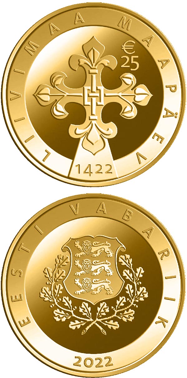 The gold coin dedicated to the Livonian Diet depicts a cross ornamented with plant leaves, using an idea from a carving in dolomite above the door of the southern vestibule of the Karja Church in Northern Saaremaa, built in 1334–1340. The design symbolises the unified, certain and continuing growth and spread of Christianity in the Middle Ages. The Livonian Diet was convened with the same goal. Second place in the design competition for the gold coin went to Heino Prunsvelt and third to Tiiu Pirsko and Mati Veermets. There were 18 designs submitted for the competition.