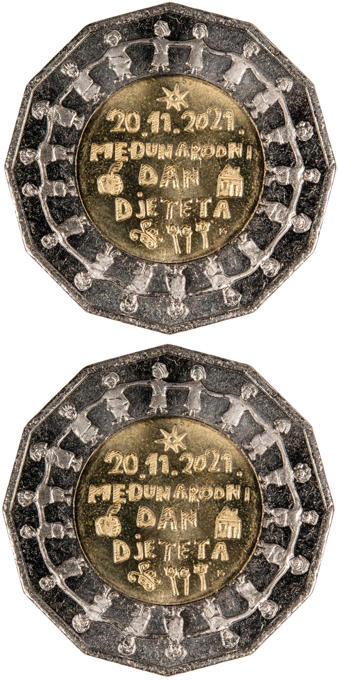 Motif on the obverse: the inner part of the core features a house, an apple, the sun, a butterfly and flowers, symbolising the well-being and some of the fundamental rights of the child: a safe home, food and free play in the nature. The day of observance marking the World Children's Day “20. 11. 2021.” and the text “MEĐUNARODNI DAN DJETETA” (WORLD CHILDREN'S DAY) are inscribed in the coin core. An image of children connected together in a circle dance, symbolising their cooperation and togetherness as well as creativity and play, is laid out circularly within the coin's ring.