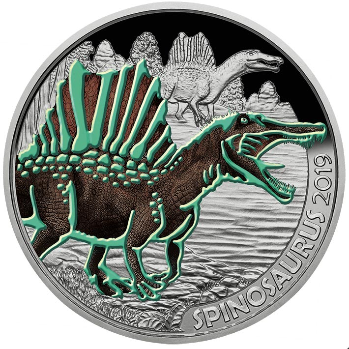 Spinosuarus features all 12 prehistoric animals in the Supersaurs series in silhouette on its obverse, while a colour-printed Spinosaurus is shown on the coin’s glow-in-the-dark reverse. All 12 of the 3 euro coins in the Supersaurs series are legal tender in Austria.