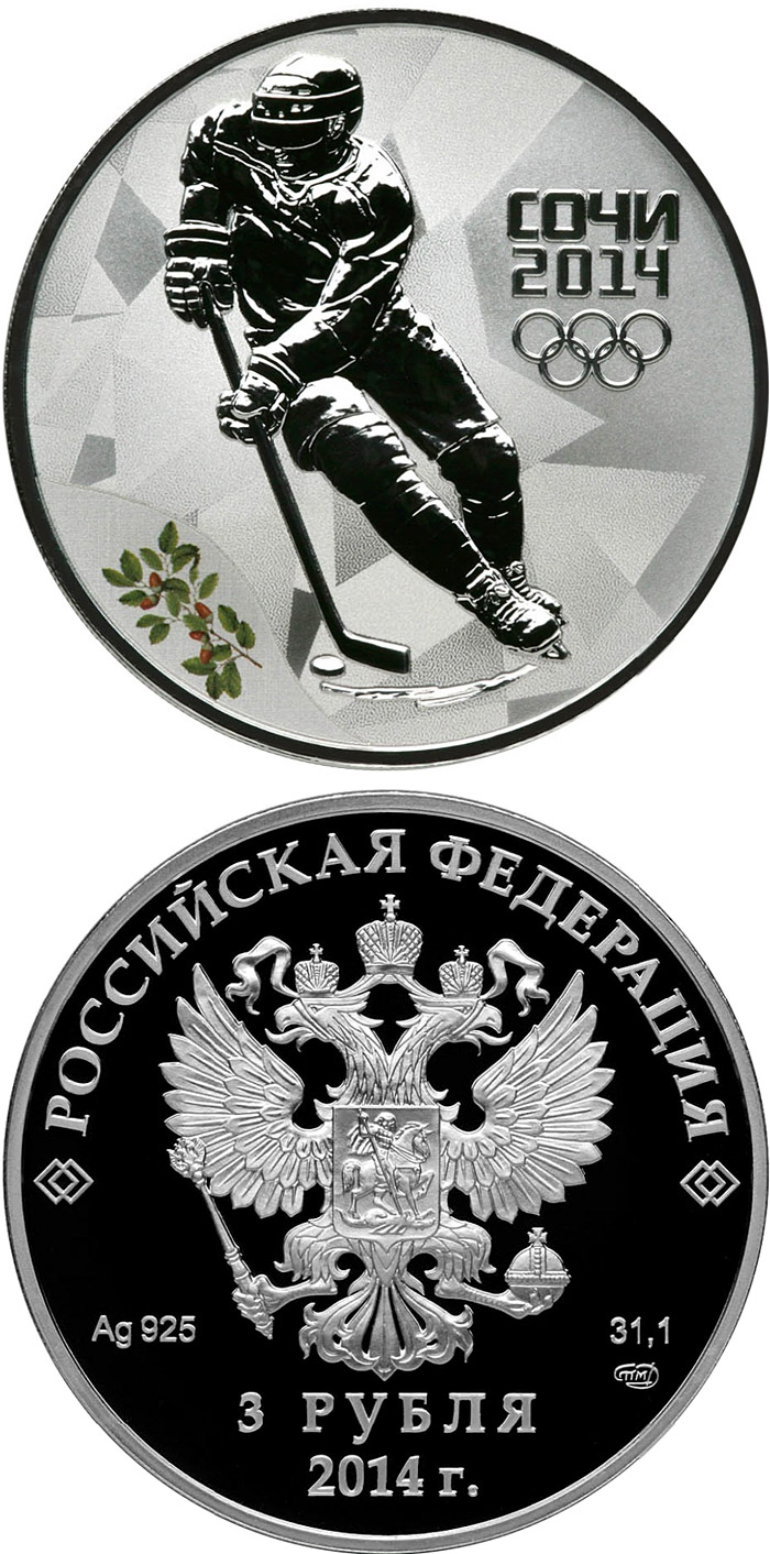 in the central part of the disc, to the left - the relief image of a hockey player forwarding a puck, to the right of it - the inscription: "СОЧИ" (SOCHI), the date: "2014" and five Olympic rings in three lines, below to the left, at the edge - the colored image of a little branch of the cork oak.