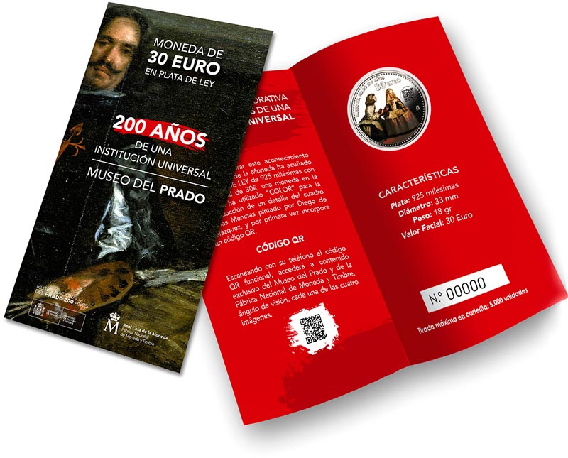 On the occasion of the Bicentennial of the Prado Museum, a 30 euro silver coin has been issued, in which, colour has been used for the reproduction of a fragment of Velázquez's "Las Meninas" painting.
