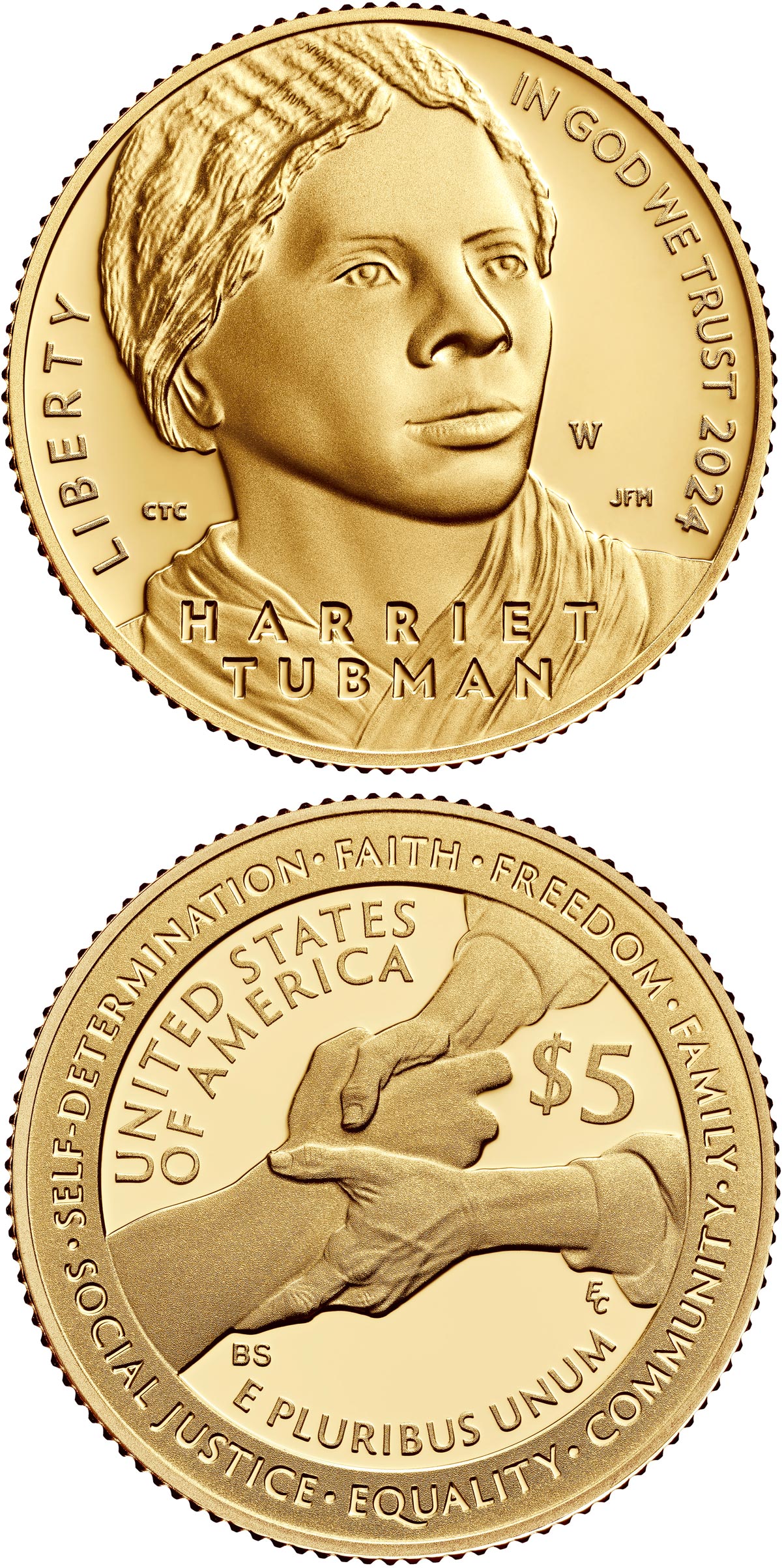 The coins follow the three periods of Harriet Tubman’s life and work. The silver dollar designs reflect her work as a conductor on the Underground Railroad. The half dollar clad designs represent her work during the Civil War. The $5 gold coin represents her life after the Civil War and her later years.