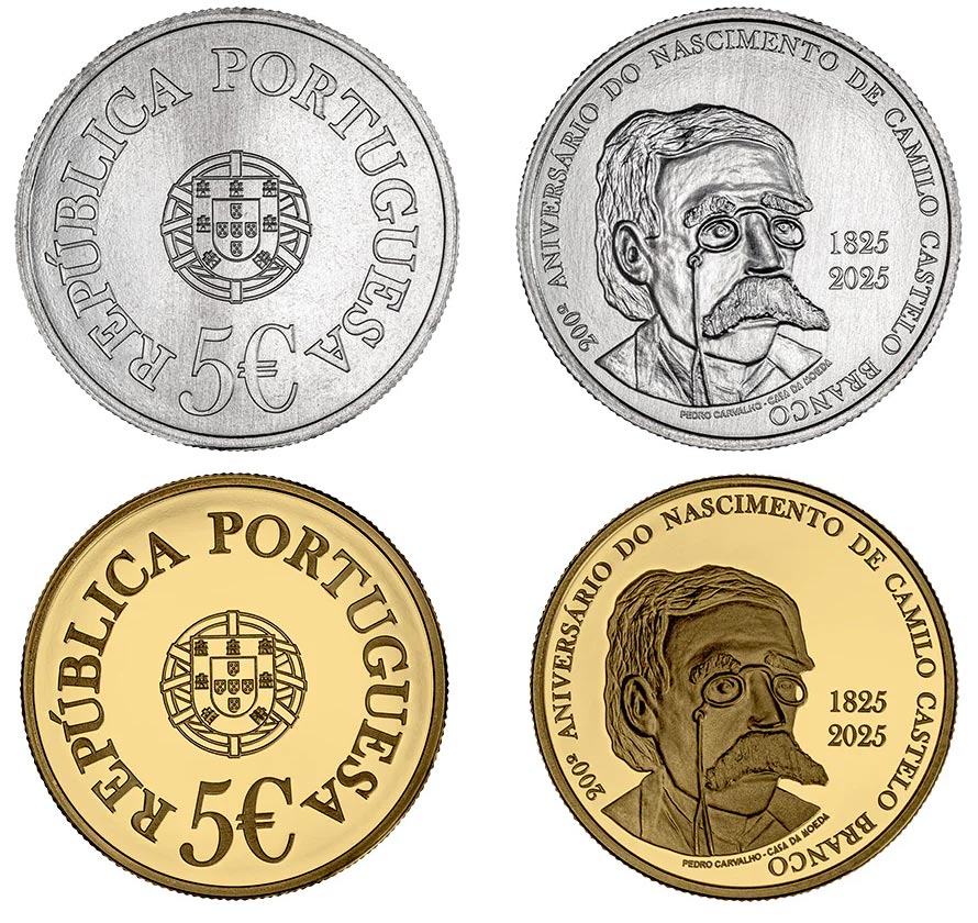 Celebrating the 200th anniversary of Camilo Castelo Branco's birth, this coin designed by Pedro Carvalho honors the prolific writer known for his romantic novels and social insights. This coin reflects his literary legacy and enduring influence on Portuguese culture.