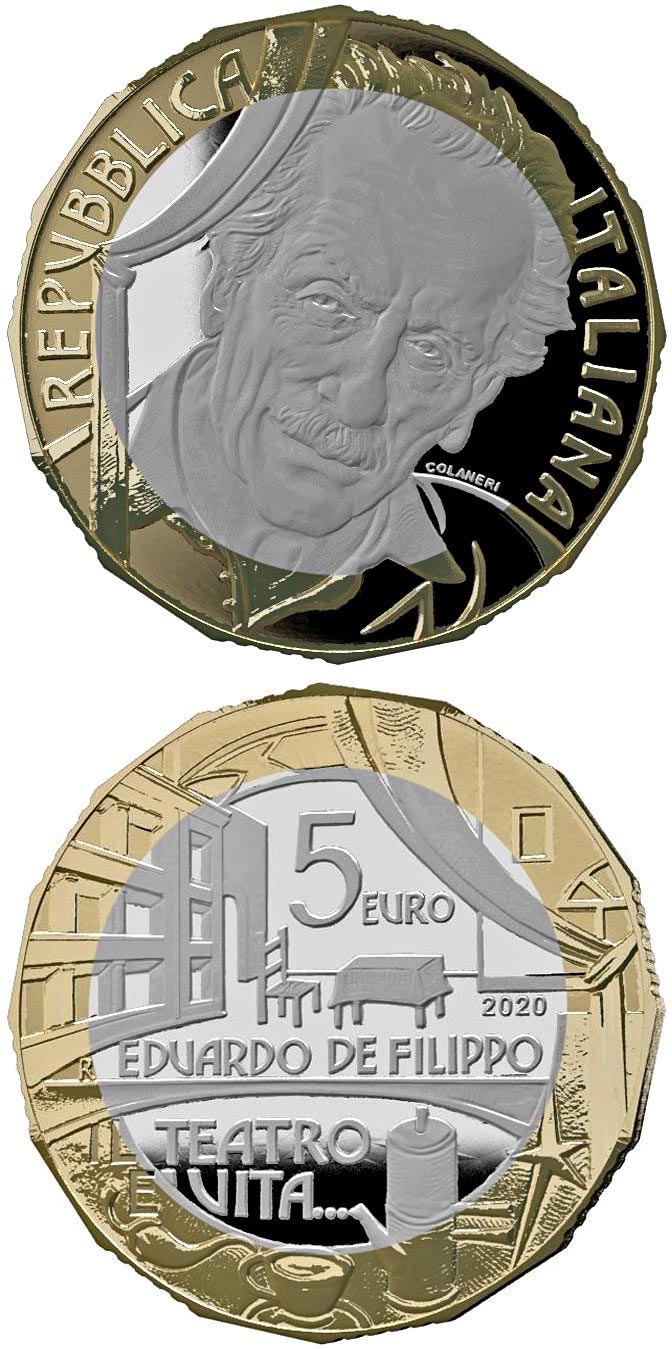 Reverse: proscenium of a typical Italian theatre where the scene is set: the curtain opens to reveal a stage with a chair, a table and the inscription "EDUARDO DE FILIPPO”. Above, the value "5 EURO"; on the right, the coin’s year of issue, "2020"; on the left, "R" identifying the Mint of Rome; below, the inscription “IL TEATRO È VITA” ("THEATRE IS LIFE") and some typical elements from the works of Eduardo De Filippo: a cup, a coffee maker, a lucky horn and a star, symbol of the nativity scene.