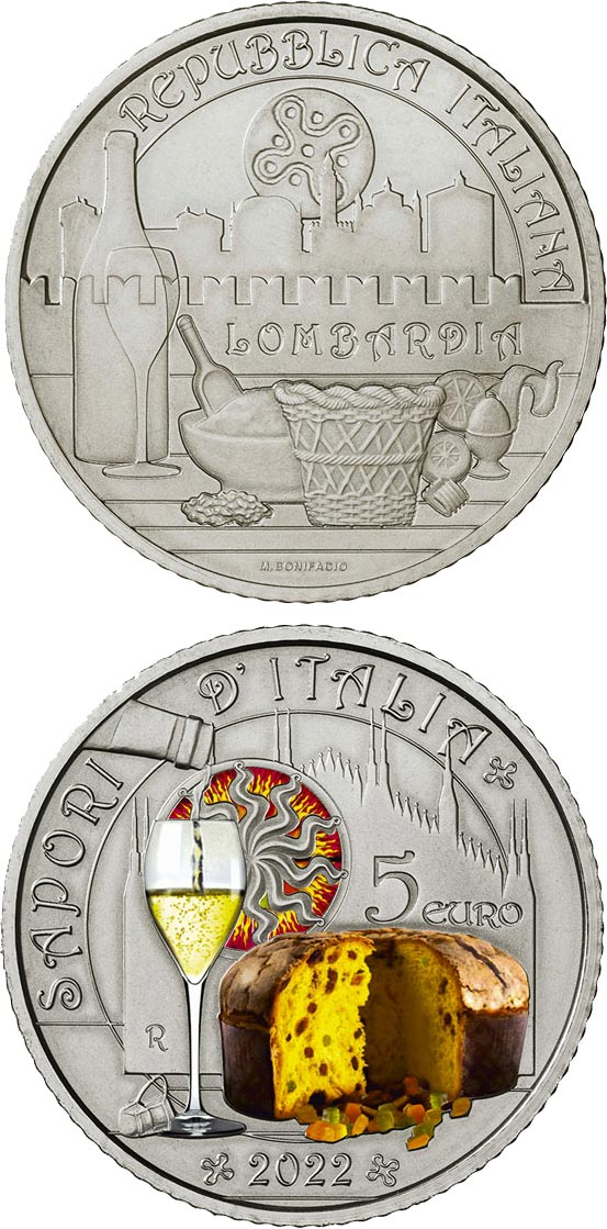 Obverse: in the foreground some ingredients of the “Pan de Toni” which, according