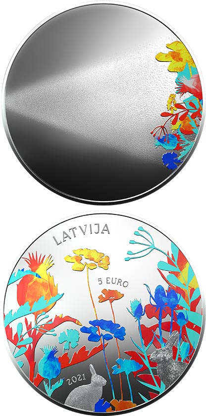 The world discovered by imagination is Latvia's wonderful nature. It is a flowering meadow where we also find two of its inhabitants: the white hare (Lepus timidus) and the grey hare (Lepus europaeus). These creatures symbolise agility, wit, fertility and magical power.