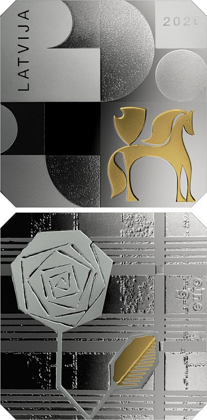 The coin features elements from the works of architect Marta Zigrīda Staņa (1913–1972), porcelain artist Zina Ulste (1928–2005), graphic designers Gunārs Kirke (1926–1993) and Uldis Razums (1944–2019). The different graphic means of expression testify to the unifying phenomenon of modernism stylistics; equally, this was also a way you could speak about the potential freedom in those days.