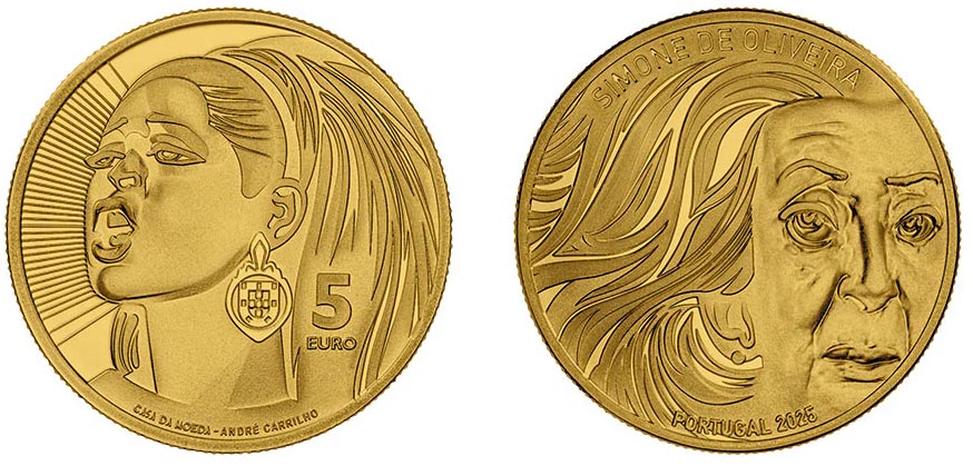 This coin, part of the "Portuguese Musicians" series, honors Simone de Oliveira, a cultural icon known for her powerful voice and presence. Designed by André Carrilho, the coin captures key moments of her career, celebrating her impact on Portuguese music and performing arts.