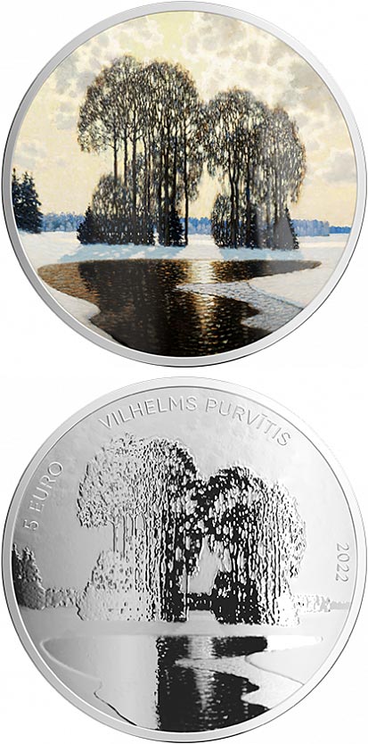 The author of the graphic design of the coin "Vilhelms Purvītis" is Frančeska Kirke. The coin created by the artist interprets elements of the painting "Winter" by Vilhelms Purvītis: the lacy majestic birch trees, glittering water of the unfrozen lake and overcast winter sky. She transfers these elements to the silver coin in an elegant manner, using frosting, texture and mirror surface of varying intensity.