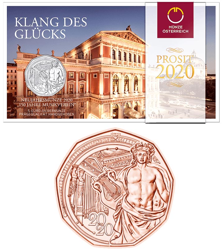 Celebrating the 150th anniversary of the opening of Vienna’s legendary Musikverein concert hall in 1870, the New Year coin 2020 features the Greek god, Apollo. The image of the god of music and dance is taken from a frieze, designed by August Eisenmenger (1830-1907), found on the ceiling of the Golden Hall of the Musikverein, the spiritual home of classical music in the Austrian capital. New Year in Austria is all about music. We wish you a harmonious 2020.