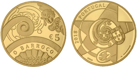 The Portuguese coin, designed by sculptor António Marinho, mixes religion with the profane with recognised features of the baroque style. On the coin a cherub - a spiritual element - is seen alongside a wealth of ornaments and the image of a shell with precious stones, symbols of material wealth.