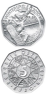 Each coin displays a winter discipline in which Austria is a world-leading performer. The first has as its theme ski jumping. One sees the helmeted ski-jumper captured in his flight from the end of the steep ramp against a background of trees in an alpine forest.