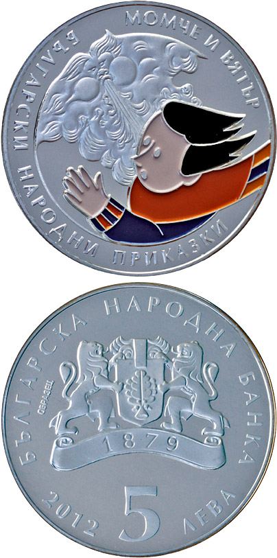 The reverse of the coin features a coloured design illustrating the folk tale ‘The Lad and the Wind’. ‘БЪЛГАРСКИ НАРОДНИ ПРИКАЗКИ’ (BULGARIAN FOLK TALES) and ‘МОМЧЕ И ВЯТЪР’ (THE LAD AND THE WIND) are inscribed in circumference.