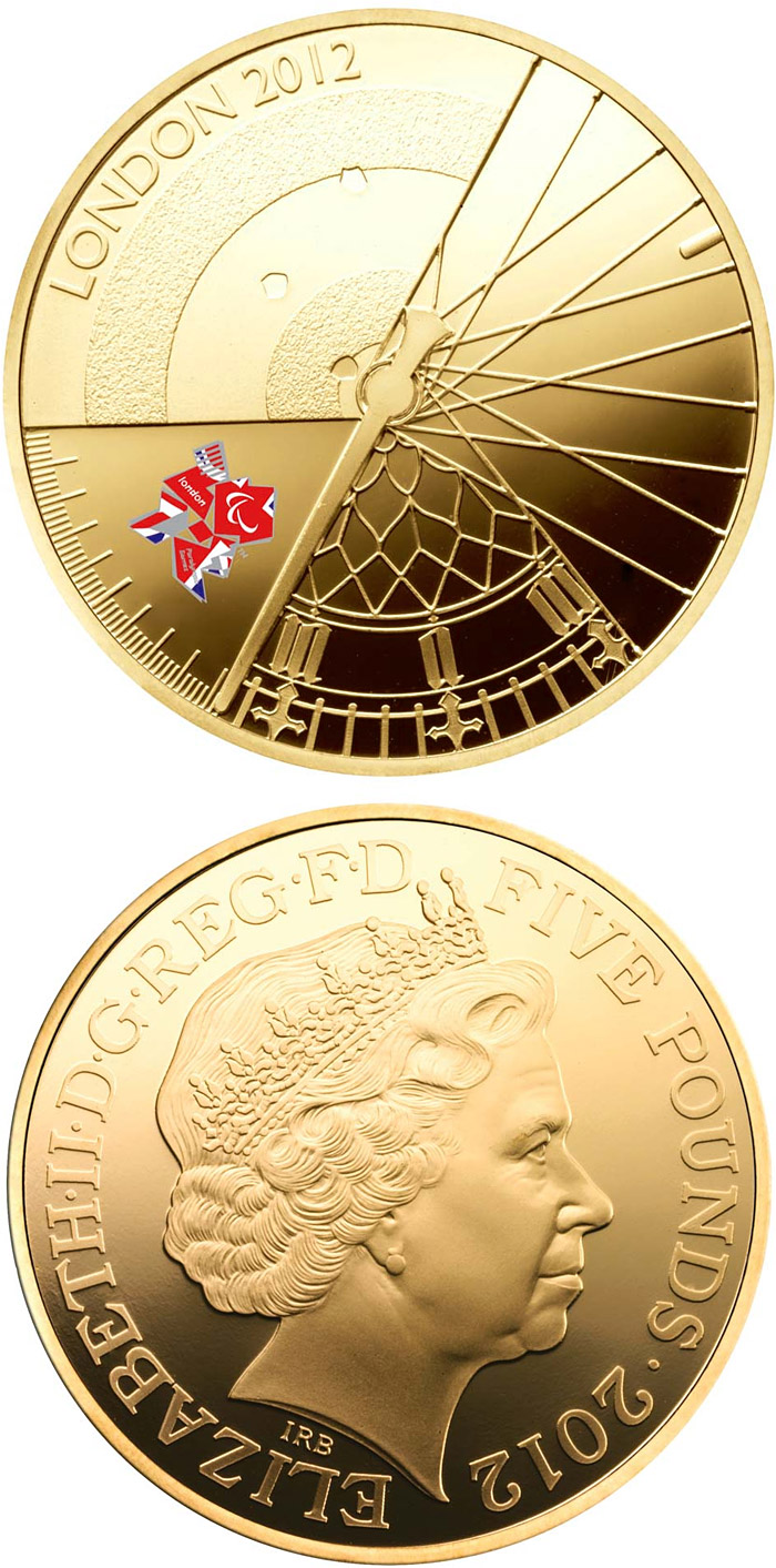 Image of 5 pounds coin - London 2012 Paralympic Games | United Kingdom 2012.  The Gold coin is of Proof quality.