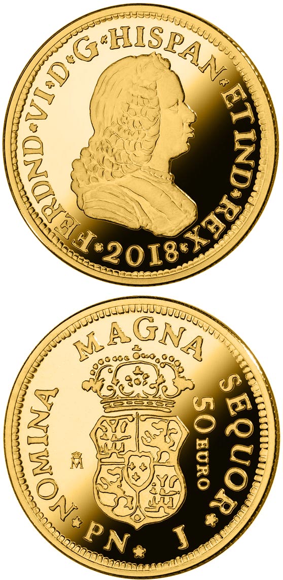 The obverse of this coin shows the wigged bust of Fernando VI, surrounded by the legend FERDND.VI.D.G.HISPAN.ET.IND.REX. The mint year, 1759, is replaced by 2018 on the current piece.