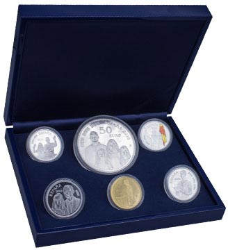 On the reverse, the Royal Family, together with three sets of links from the collar chain of the Distinguished Order of the Golden Fleece.