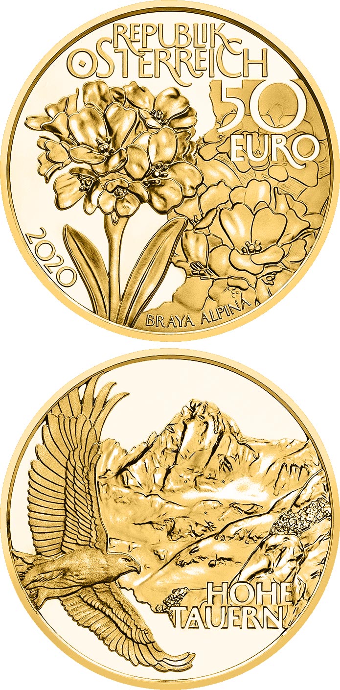 More than a third of all plant species recorded in Austria can be found in the Hohe Tauern, including half of all mammals, birds, reptiles and amphibians. Among the park’s 3,500 plant species is a botanical rarity in the Eastern Alps, the endemic Alpenbreitschötchen, a member of the family of cruciferous vegetables. The special protection area on the Grossglockner is one of the few locations where the plant can be found in Austria. The coin’s obverse features different images of the Alpenbreitschötchen above the plant’s Latin name, Braya alpina.