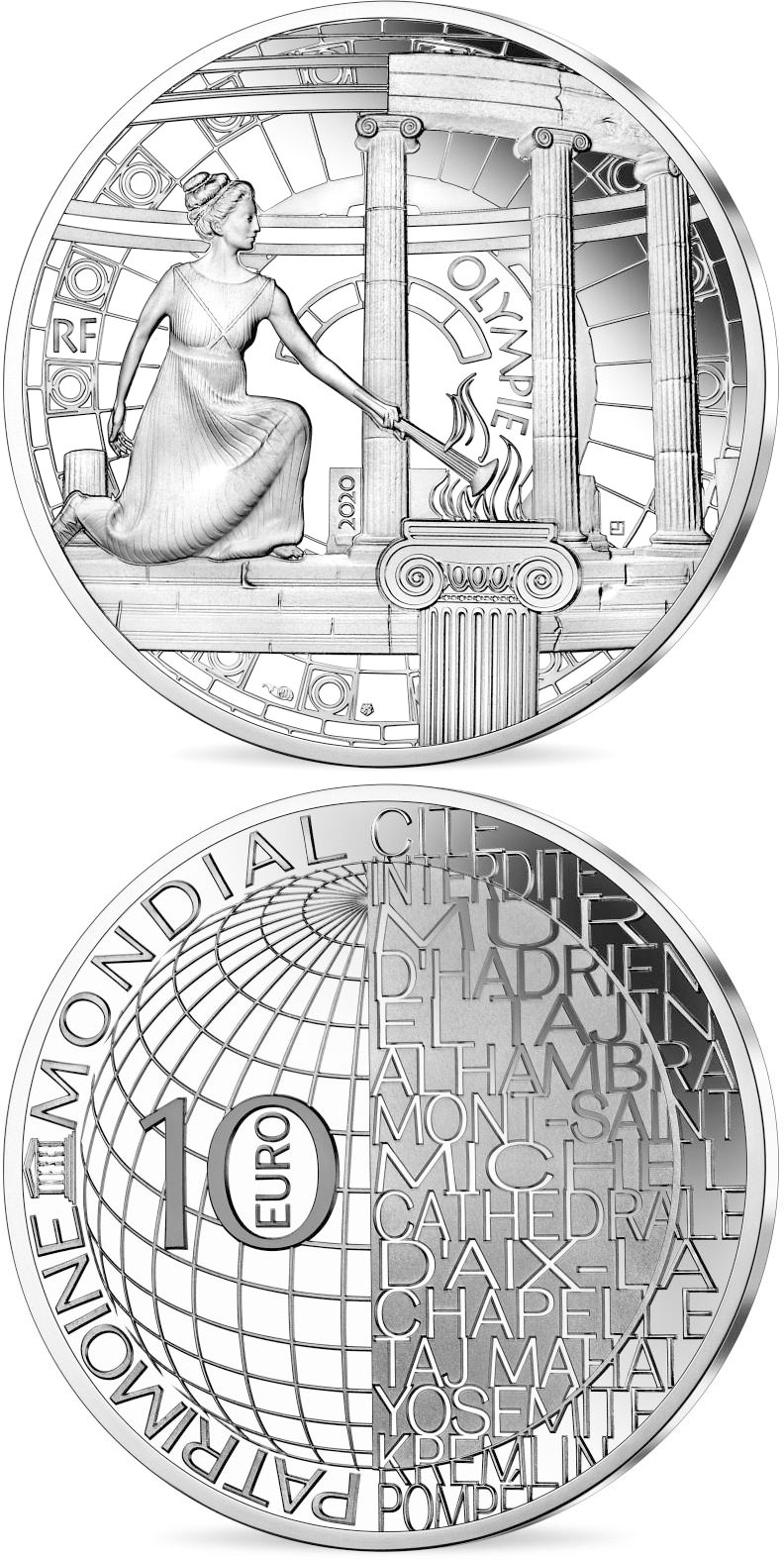 The obverse represents the archaeological site of Olympia with its columns made from the remains of ancient monuments. The birthplace of the Olympic Games is translated by the flame that gushes out of the basin. An Olympian goddess tries to light her torch with this Olympic flame. The geometric shapes at the back of the coin evoke the famous Greek amphitheatres and therefore the first Olympic stadiums that hosted the Games in antiquity.