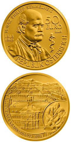 The new gold coin with a face value of 50 Euro has a portrait of the celebrated doctor himself together with the staff of Aesculapius, which is the logo for the entire series. The reverse has a bird’s eye view of the old General Hospital in Vienna, where Semmelweis was stationed in the childbirth clinic. An insert to the right shows a doctor and a student in the act of disinfecting their hands before examining a patient.