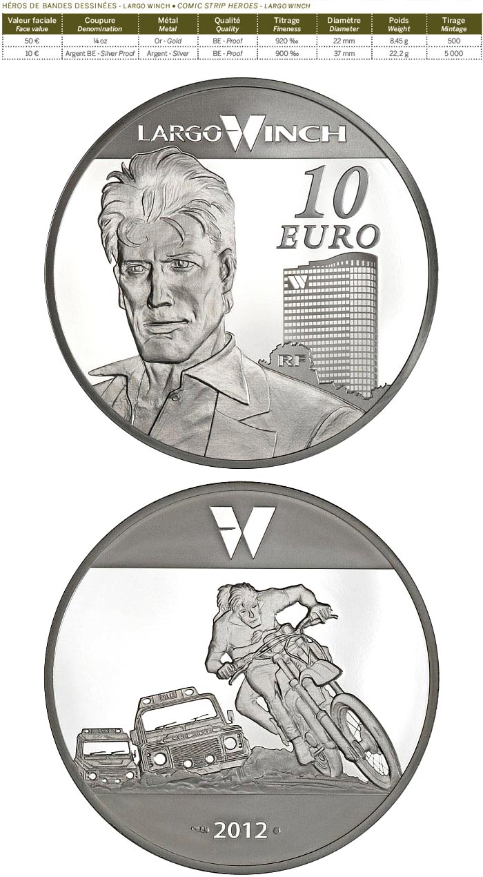 Monnaie de Paris continues its series on comic strip heroes. After XIII in 2011, it is Largo Winch in the spotlight this year. This famous comic strip character, created by Jean Van Hamme and Philippe Francq, is the adopted secret son of a billionaire. When the latter passes away, Largo Winch finds himself as the head of his father's huge financial empire. The saga describes the numerous adventures of this extraordinary character. The coins in the Largo Winch collection symbolise the two sides of this hero: his power that stems from his rich heritage and his adventure-filled life fraught with enemies. A scene depicting a high-speed chase between the FBI and Largo Winch, which is particularly representative of the saga, features on the obverse. This scene is taken from the album "Black Sea" where the hero is unwittingly involved in a case of arms trafficking and international terrorism. On the reverse, Largo Winch is depicted in his role as a businessman. The skyscraper for his company, Group W - the largest conglomerate of multinationals - rises up in the background. For aficionados of this comic strip there will also be a range of specially created items inspired by this theme.