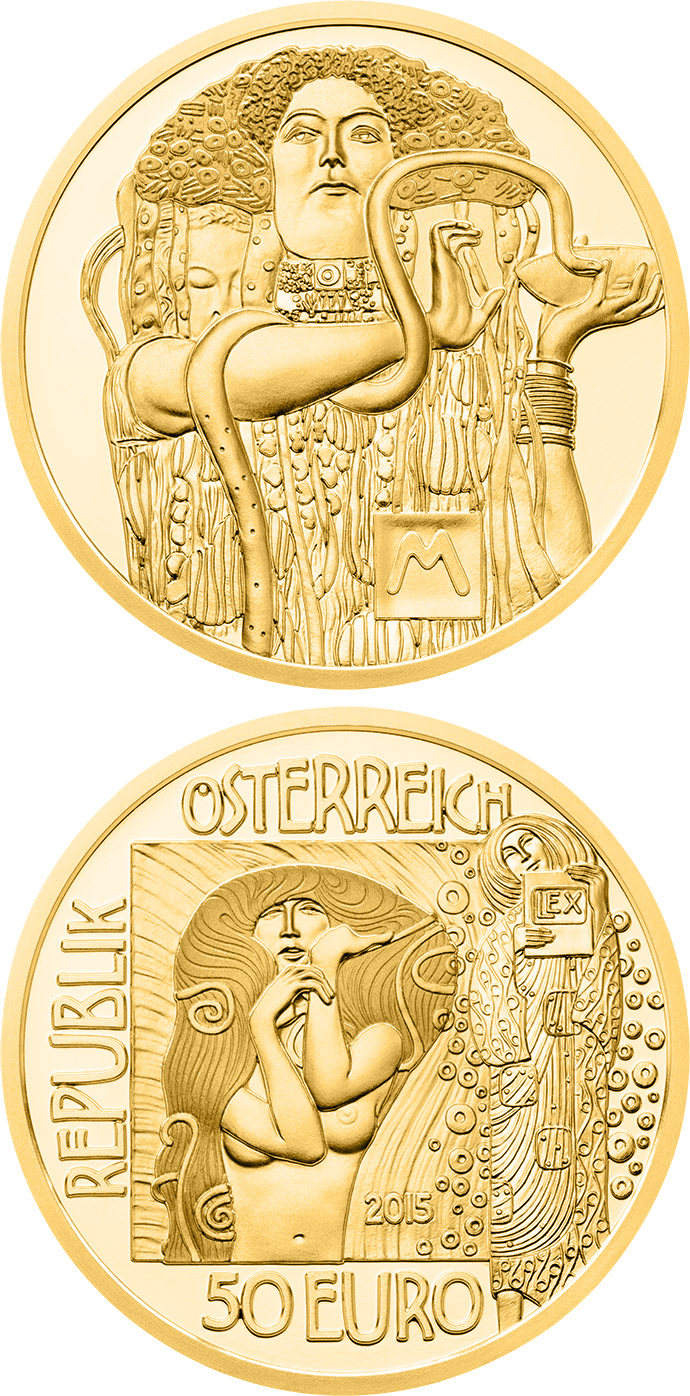 Originally painted to decorate the ceilings of the University of Vienna, Klimt's Faculty Paintings became the subject of major controversy when the critics and public alike reacted strongly to the way they broke cultural taboos and pushed the boundaries of obscenity. The obverse of the coin features Jurisprudence in the form of the Eumenides, the Greek deities of vengeance, while the reverse shows Medicine as Hygeia, daughter of the Greek god of medicine.