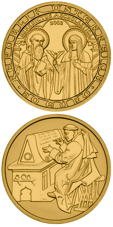 The coin shows a double portrait of St. Benedict and his sister, St. Scholastica. Not only is St. Benedict the patron saint of western Europe, he is the father of western monasticism. St. Benedict wrote a rule for monks of some 73 chapters, "a little rule for beginners". His writing is of such deep spirituality and yet so full of moderation and humanity, that the Rule of St. Benedict became the basis for monastic life from the sixth century right down to the present day. Under the leadership of his sister, he founded also an order of nuns following the same rule. The coins shows him holding a book, which is the Holy Rule. St. Scholastica holds a dove, a reference to the vision St. Benedict had of his sister’s soul rising like a dove into heaven. This side of the coin has a mediaeval monk sitting at a writing desk copying (or decorating) a manuscript. The work of the monks in the Middle Ages copying books by hand preserved great areas of knowledge for future generations. Most of the classics of ancient Greece and Rome are known to us only through mediaeval copies.