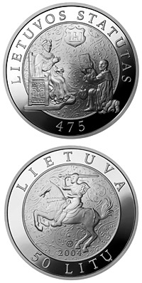 The centre of the obverse of the coin displays a historical 16th century symbol of the Vytis, similar to the drawing of the Vytis published in one of the copies of the Statute of Lithuania. The area around the Vytis has a floral damascened background.At the top runs the inscription LIETUVA (Lithuania) in the shape of a semi-circle, and, at the bottom, 50 LITŲ (50 litas) and 2004. The reverse of the coin has a damascened background. The centre of the reverse shows Albertas Goštautas, Chancellor of the Grand Duchy of Lithuania and Palatine of Vilnius, presenting the Statute of Lithuania to King Sigismund the Old. At the top of the coin are the Columns of Gediminas and at the bottom is the Abdank, the Coat of Arms of Goštautas. The coin is encircled with an inscription LIETUVOS STATUTUI 475 (475 years to the Statute of Lithuania).