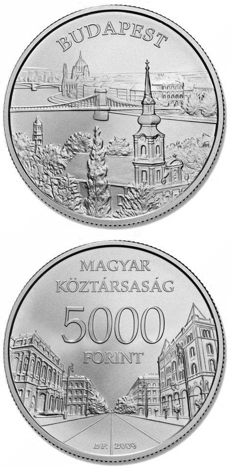 On 24 September 2009, the Magyar Nemzeti Bank issued a silver collector coin ‘Budapest’ with a face value of HUF 5,000. The coin was issued as part of the ‘World Heritage Sites in Hungary’ series. In addition to the standard design elements (the denomination: 5000, the legend: Republic of Hungary, the mint mark: BP and the date of issue: 2009), the obverse of the coin features Andrássy Avenue, with the Opera House on the left and the palace of the former Ballet Institute on the right. The reverse bears an image of the Pest bank of the River Danube between Chain Bridge and Margaret Bridge, viewed from Buda. The upper legend reads ‘BUDAPEST’. The signature mark of designer Mihály Fritz is positioned to the right from the representation of the Parish Church. The collector coin is made of .925 fine silver, weighs 31.46 grams, its diameter is 38.61 mm and it has a milled edge. The mintage limit is 10,000 pieces, of which 6,000 are produced using the special proof technology.