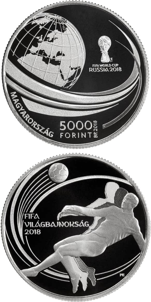 On the obverse side of the commemorative coin the stylised representation of the Earth is shown. The orbits of satellites suggest the rotation of the planet and the dynamic nature of sports. The motif refers to the global significance of the sports event. To the right, the official logo of the 2018 FIFA World Cup Russia™ is shown. The compulsory design elements are also featured here: the lettering “MAGYARORSZÁG” in the lower legend, the lettering “5,000 and 2,000 FORINT” in two lines, one below the other, and vertically oriented, the mint mark ‘BP.’, as well as the year of issuance ‘2018’; all in one column. The micro lettering representing the mint mark provides protection against counterfeiting, which was placed on the left side of the circle running to the right of the mint year. The security element is visible only when magnified at least ten times.