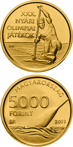 The gold coin designed by Andrea Horváth depicts a male canoe paddler.