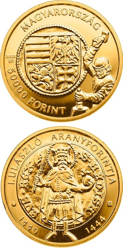 The compulsory design elements of collector coins are placed on the obverse: the lettering ‘MAGYARORSZÁG’ in the upper legend, in the lower left legend the denominations HUF 50,000 or HUF 2,000 FORINT, on the horizontal central axis the mint year and the mint mark ‘BP.’ broken into two lines above one another. On the obverse, the golden florin of Vladislaus I is shown, with the only difference being that Saint Ladislaus’s figure was enlarged against the representation on the original coin by goldsmith Zoltán Tóth, the designer of the coin. Placed in the outer ring, the lettering ‘I. ULÁSZLÓ ARANYFORINTJA’ (the golden florin of Vladislaus I) is shown in the upper legend, and in the lower legend the years 1440 and 1444 make a reference to the time of Vladislaus I’s reign. The upper and lower legends are separated by a circular, decorative motif on the left and the master mark of Zoltán Tóth on the right.The gold coin with a face value of HUF 50,000 is struck in .986 fine gold. The normal coin weighs 3.491 grams (1 ducat) and the piedfort coin weighs 13.964 grams (4 ducats). The non-ferrous metal coin with a face value of HUF 2,000 is produced from an alloy of copper (75%), nickel (4%) zinc (21%) and weighs 2.7 grams. The edge of the normal and piedfort gold coins is smooth. The piedfort version is decorated with the Latin inscription ‘WLADISLAVS DEI GRATIA REX VNGARIE’ on the edge, meaning ‘Vladislaus, king of Hungary by the grace of God’. All three coins have the same diameter of 20 mm.